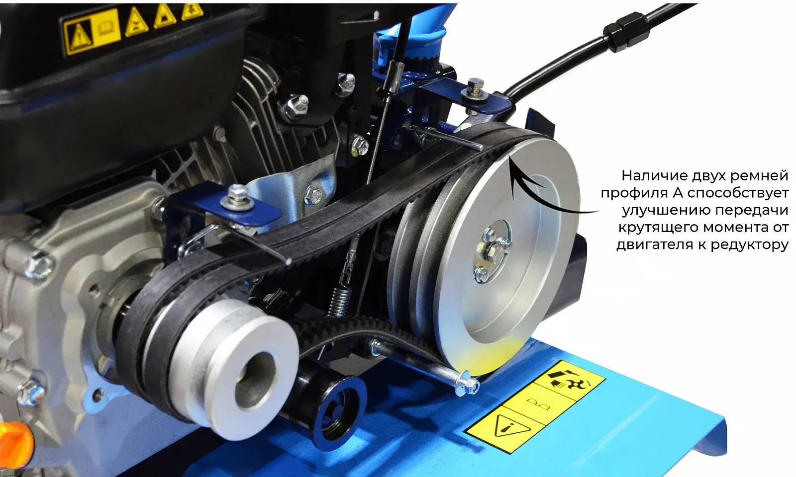 Марка двигателя: Zongshen GB225 Мощность двигателя, л.с (кВт): 7,5 (5,5) Рабочий объем, см3 224 Топливный бак, л 3 Трансмиссия: Маслонаполненный, шестеренчато-цепной редуктор в алюминиевом корпусе Количество передач: (2+1) х 2 Фреза-культиватор 4 шт Пневматические колеса 4.50*10 Тип топлива Чистый бензин АИ-92, АИ95 Число оборотов вала, об/мин 23-42 (1-я передача) 89-160 (2-я передача) Тяговое усилие, кгс до 300 (при максимальной нагрузке грузами-утяжелителями) Ширина культивации, см 85 (125 при установке доп. фрез) Масса, кг 90 Функция разблокировки: левого колеса